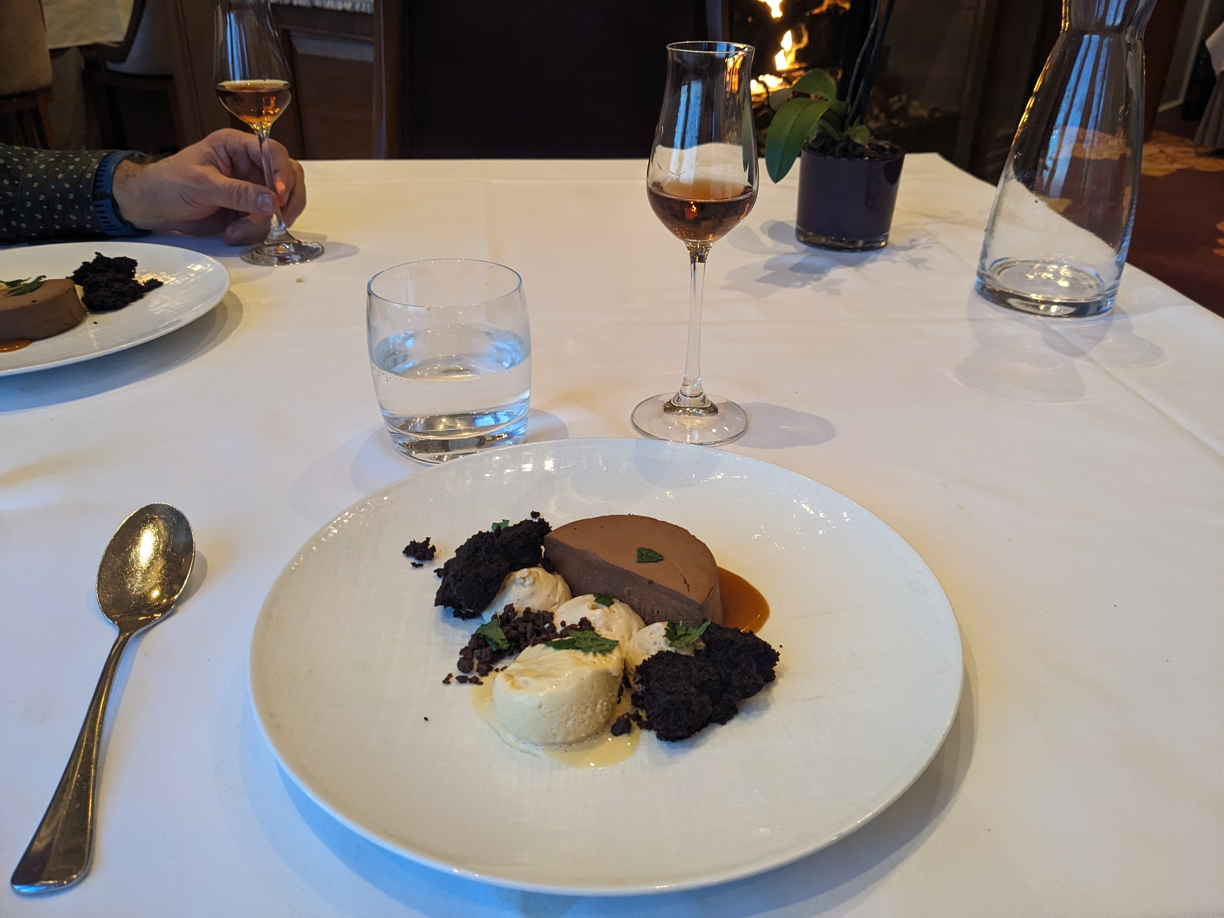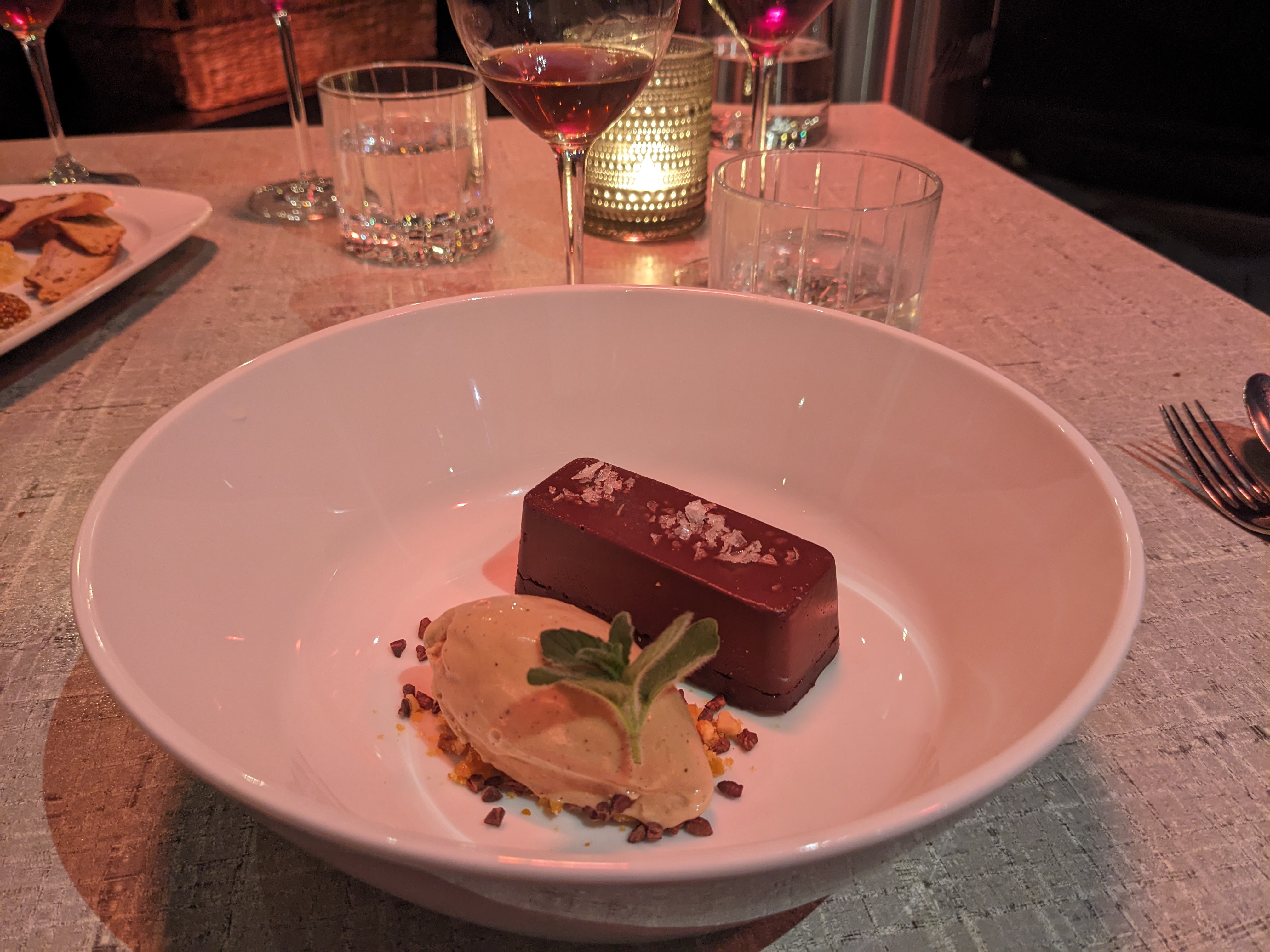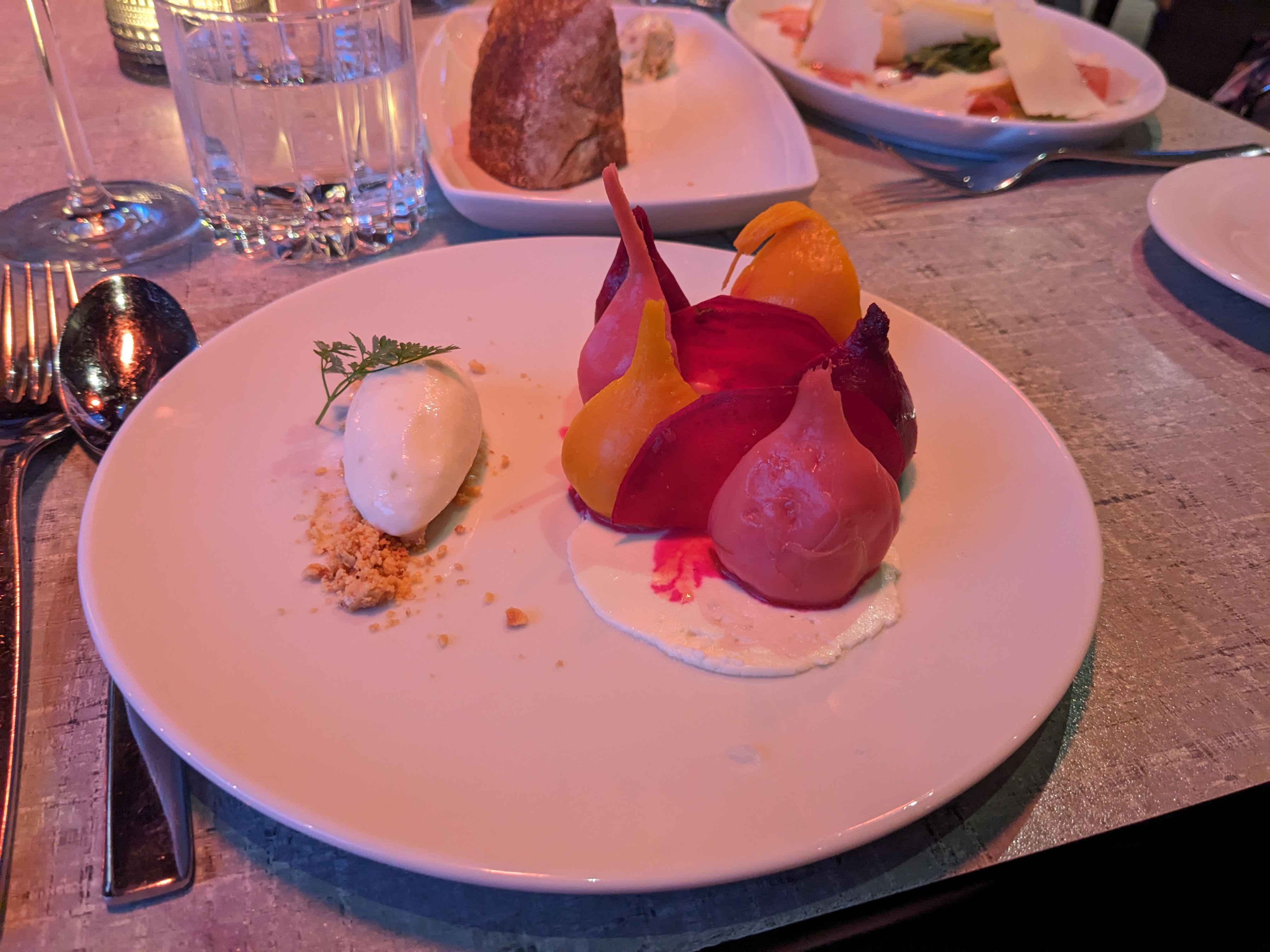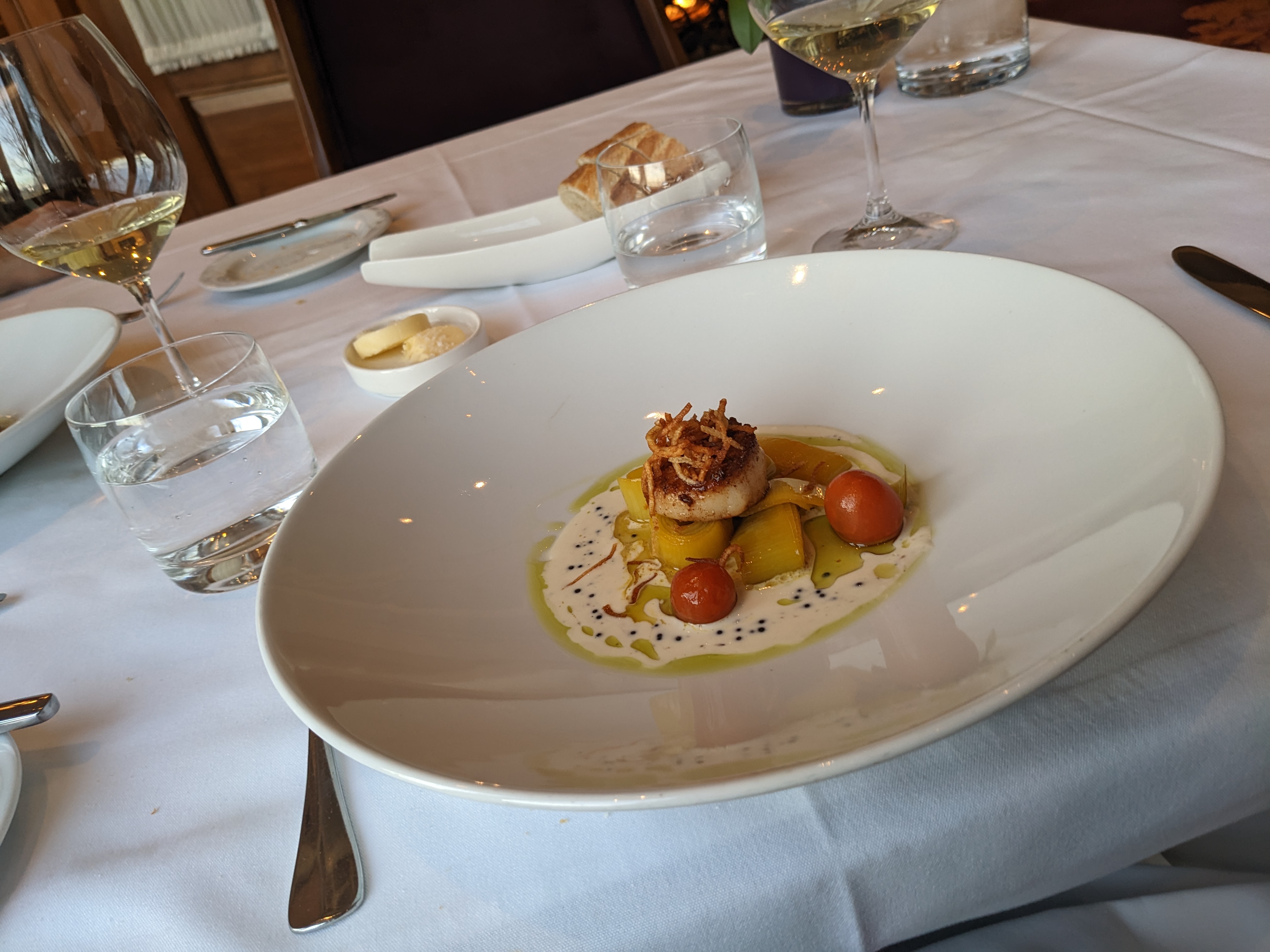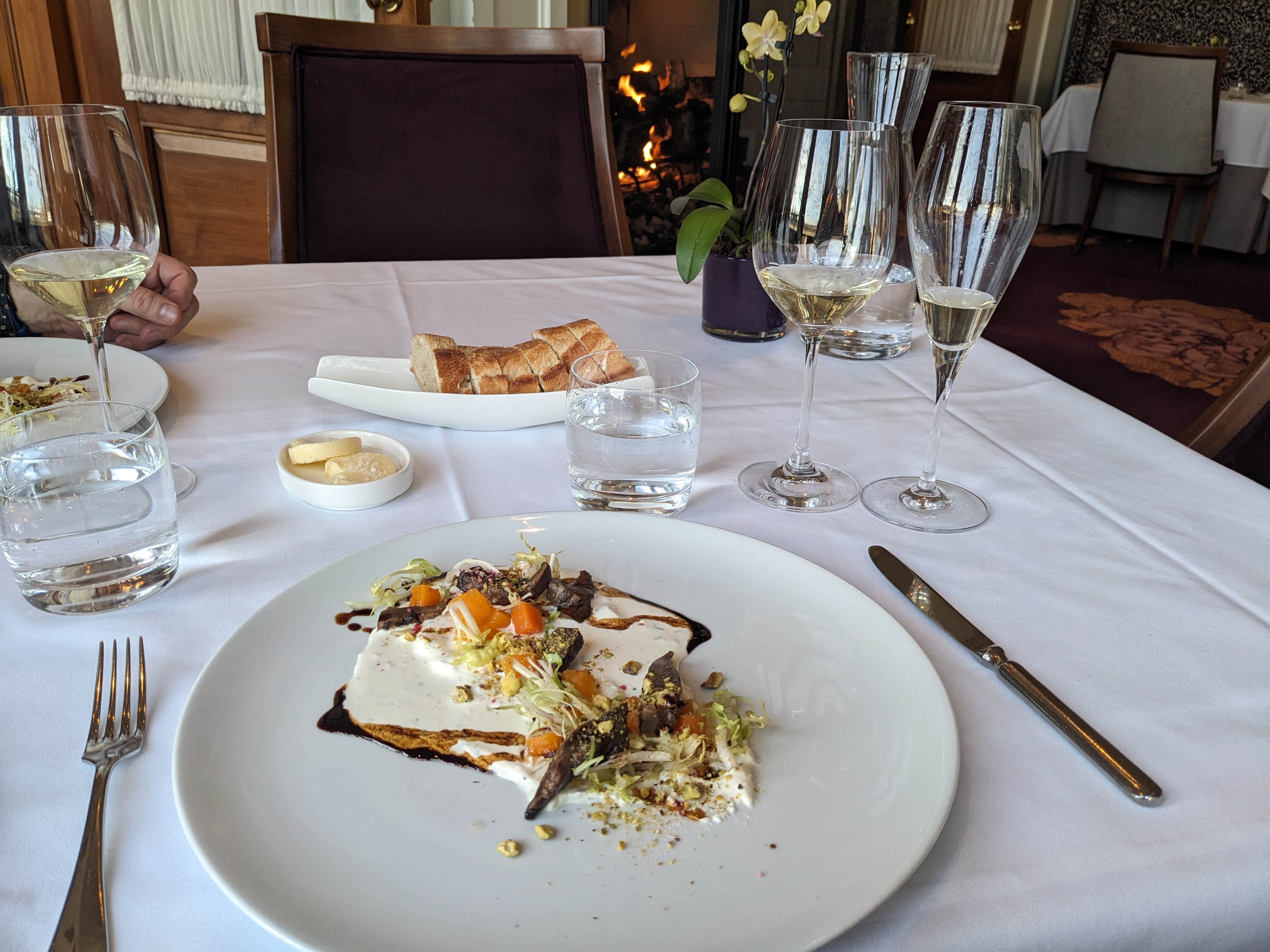 Also, with one of the courses, where we each had a white, after chatting with us a bit, the sommelier brought out a red to also try with the food—I think we both got the same one. So we could experience the contrasting options with the food. As one does.