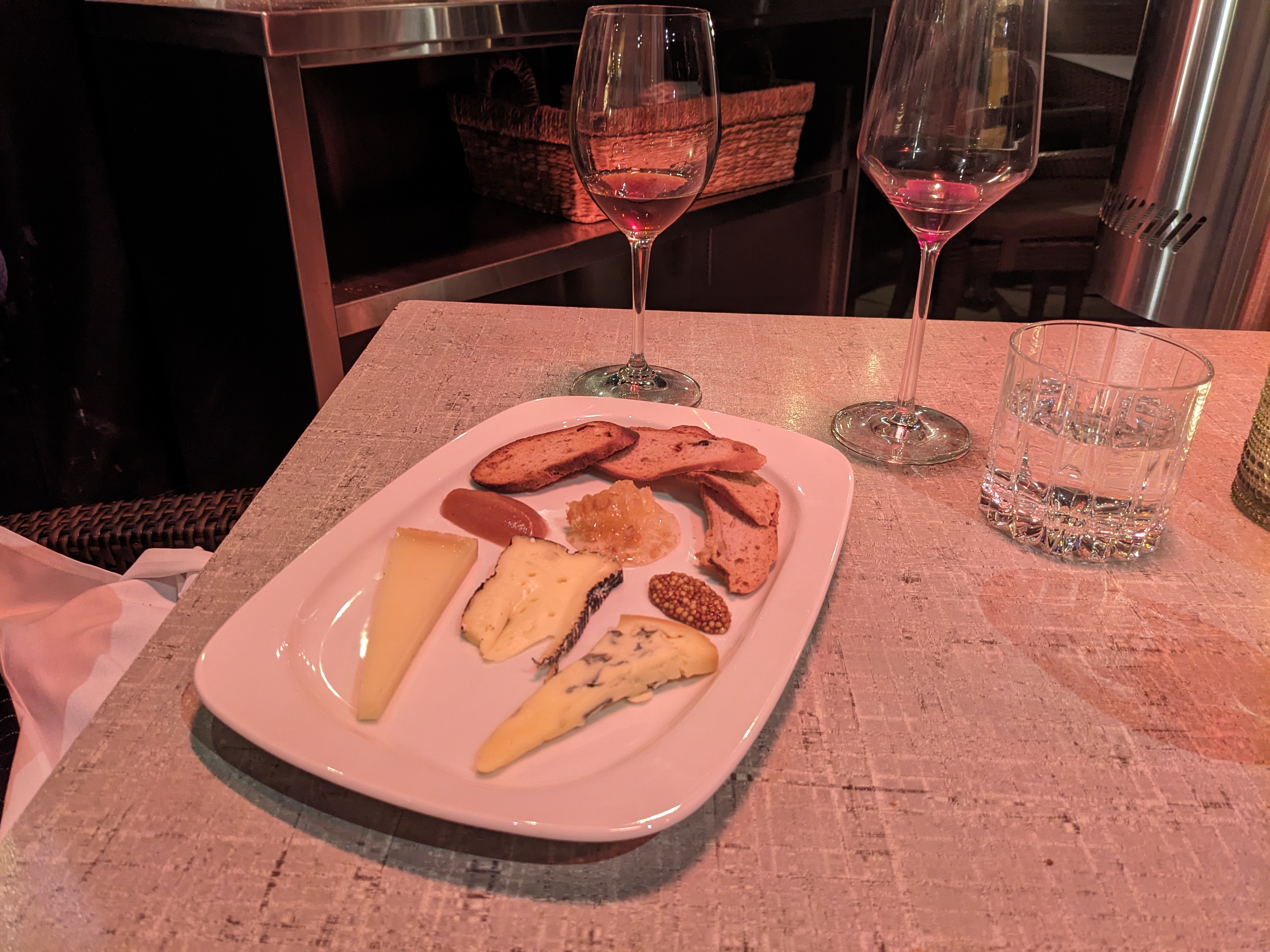 Upon arrival at our reserved seats, we were both handed the same list of wines to select from, which was confusing. We pointed out that we had opted for the prepaid “back vintage” option, along with some food. Recovery was fairly smooth; one list of wines was replaced with a much shorter one of rather pricier options, which we perused while he went off to assemble our cheese plates.